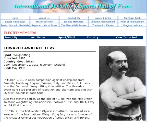 1891 1st world weightlifting championship is held in London. Edward Lawrence Levy of England wins the gold medal.